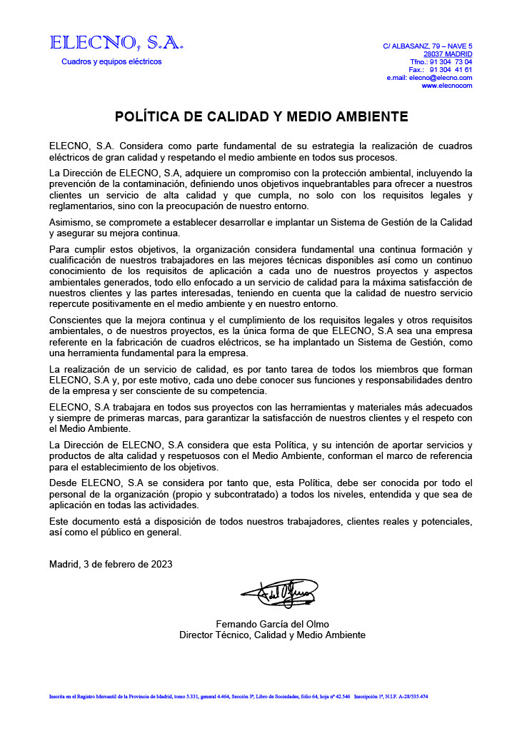 ELECNO establishes the commitment to carry out its activity within the parameters of sustainable development through Environmental Policy